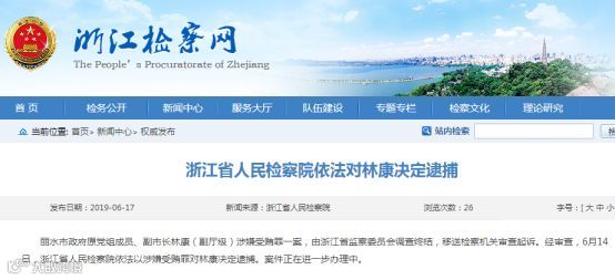 6月17日,浙江省人民检察院宣布依法决定逮捕丽水市政府原党组成员、副市长林康(副厅级)。经审查,6月14日,浙江省人民检察院依法以涉嫌受贿罪对林康决定逮捕。案件正在进一步办理中。