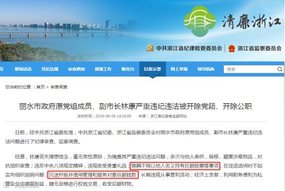而浙江省纪委省监委6月6日披露的消息显示,林康不仅利用职务便利进行权钱交易,违规收受贵重礼品,多次与他人串供,转移、藏匿涉案物品,还隐瞒不报以他人名义持有巨额股票等事项,沉迷炒股并借用管理和服务对象巨额钱款。