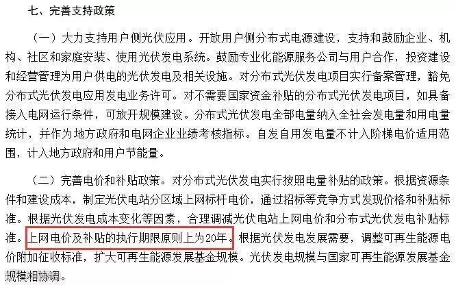 熟悉光伏的伙伴都知道,之前小编也不止一次告诉过大家,光伏发电国家补贴20年的政策出处主要有两处:一个出处为国务院于2013年07月04日发布的国发〔2013〕24号《国务院关于促进光伏产业健康发展的若干意见》。其中第七大条完善支持政策中明确指出:上网电价及补贴的执行期限原则上为20年。