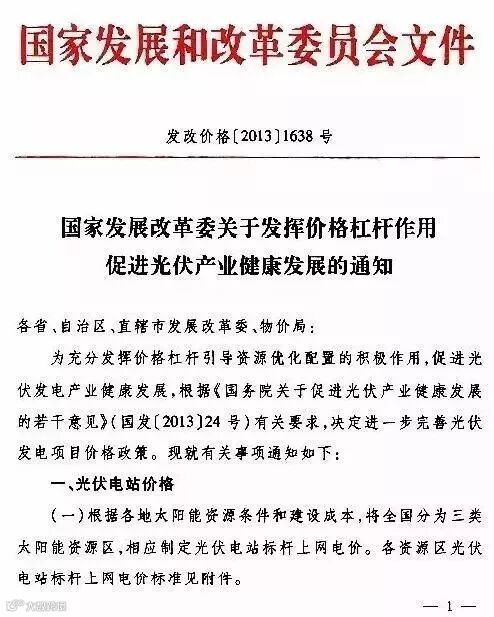 另一出处为2013年8月26日国家发改委发布的发改价格〔2013〕1638号。文件中明确提出:光伏发电项目自投入运营起执行标杆上网电价或电价补贴标准,期限原则上为20年。