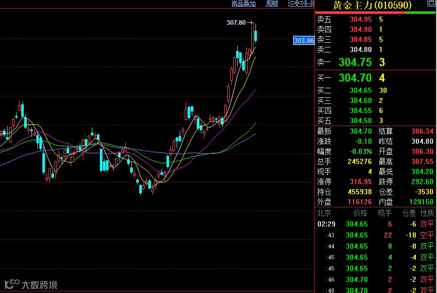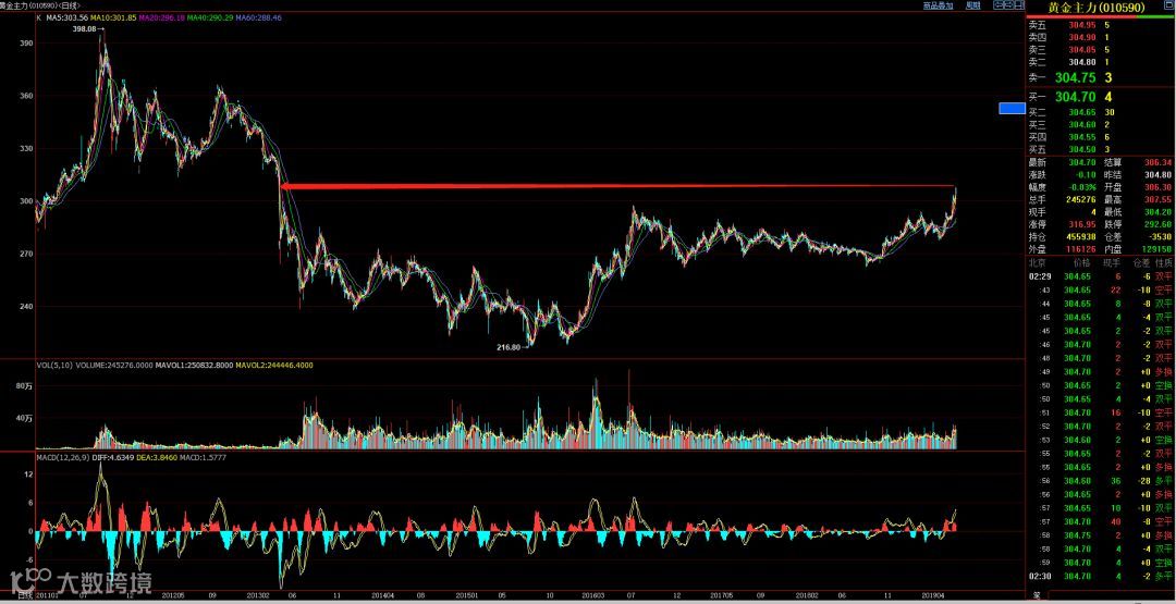 6月14日收盘时,上海期货交易所黄金主力合约报价304.70元/克。从5月6日282.70收盘价格计算,人民币计价的黄金价格已经上涨了22元/克,创下6年多以来新高。