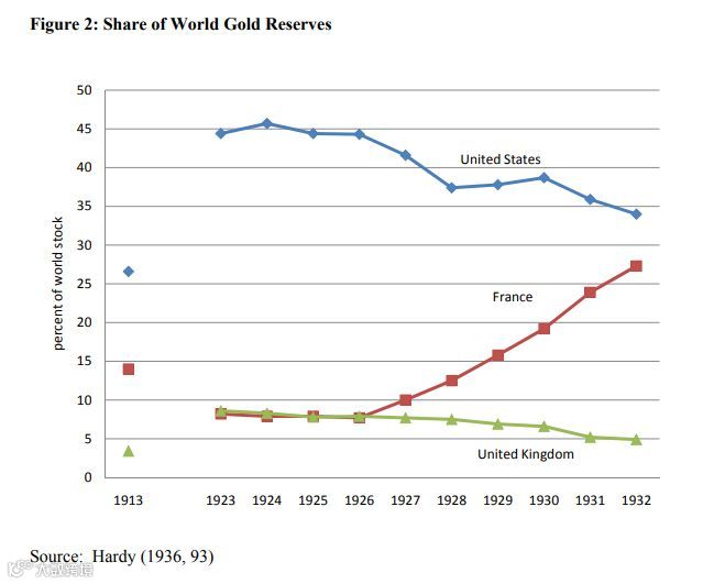 这直接推动法国出口猛增,巨额贸易顺差加上投资利润回流,黄金大量流入法国。1928年以后,法国拥有的黄金数量开始大幅攀升,而英美两国黄金货币则在快速下跌。