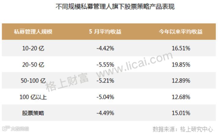 在下跌行情中,大规模的私募调仓灵活度受限,往往不及中小私募。所谓“船小好掉头”,分类来看,10亿-20亿规模私募的5月业绩表现要优于20亿以上的私募。