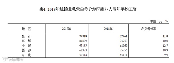 分四大区域看,2018年城镇非私营单位就业人员年平均工资由高到低依次是东部、西部、中部和东北,分别为93253元、75755元、68969元和65411元。