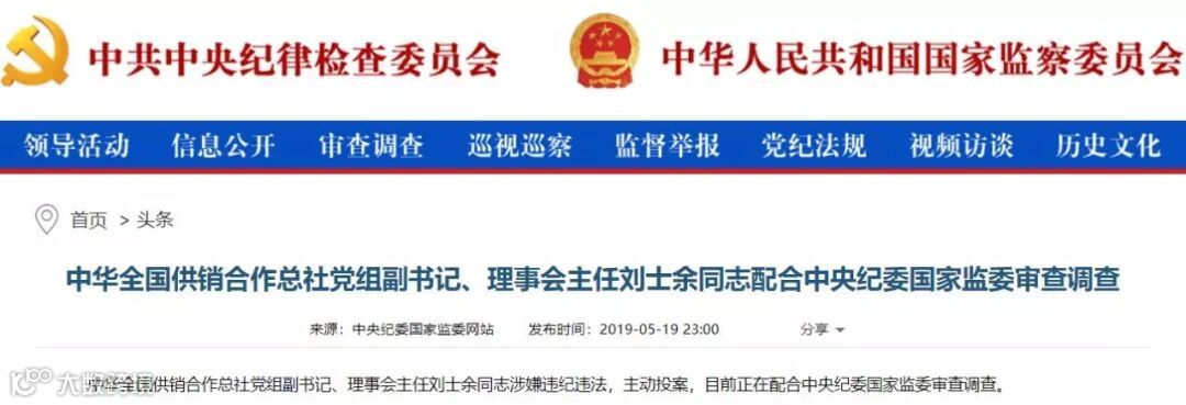 来自中央纪委国家监委的消息,中华全国供销合作总社党组副书记、理事会主任刘士余同志涉嫌违纪违法,主动投案,目前正在配合中央纪委国家监委审查调查。