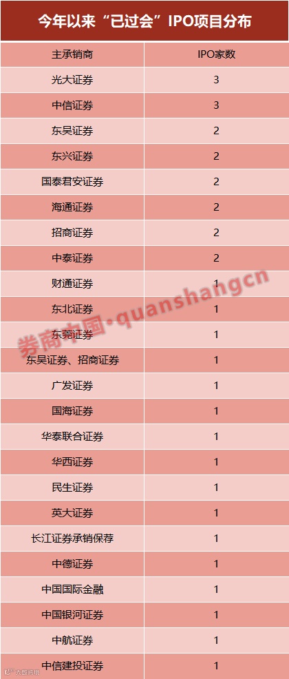 WIND数据显示,今年已有IPO过会的主承销商,家数最多的是中信证券和光大证券,分别已有3家IPO过会,其次是国泰君安、招商证券、海通证券、东兴证券、东吴证券、中泰证券各拥有2家,再而是中金公司、华泰联合、广发证券、银河证券、中信建投、中航证券、华西证券、民生证券、英大证券、长江证券、中德证券、东北证券、财通证券。
