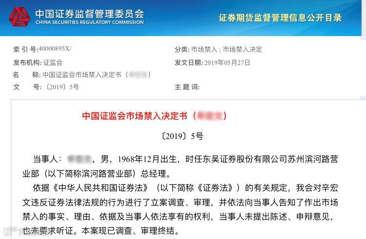 原东吴证券某营业部总经理辛某某,借用其母亲名义炒股,甚至长期用营业部电脑下单,获利逾千万。被监管罚没2187万元,同时被罚3年证券市场禁入。