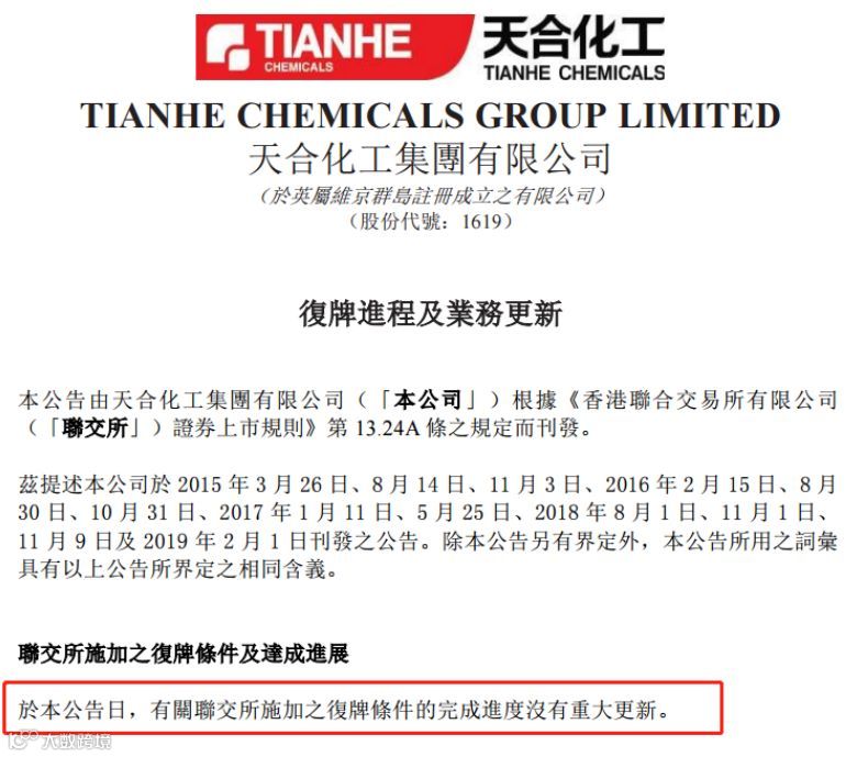 4月30日,天合化工公告称,“于本公告日,有关联交所施加之复牌条件的完成进度没有重大更新。”而在3月29日,天合化工称将延迟刊发2018年年报。此前,天合化工2014年全年业绩、2015年中期业绩、2015年全年业绩、2016年中期业绩、2016年全年业绩、2017年中期业绩、2017年全年业绩及2018年中期业绩均延迟刊发。