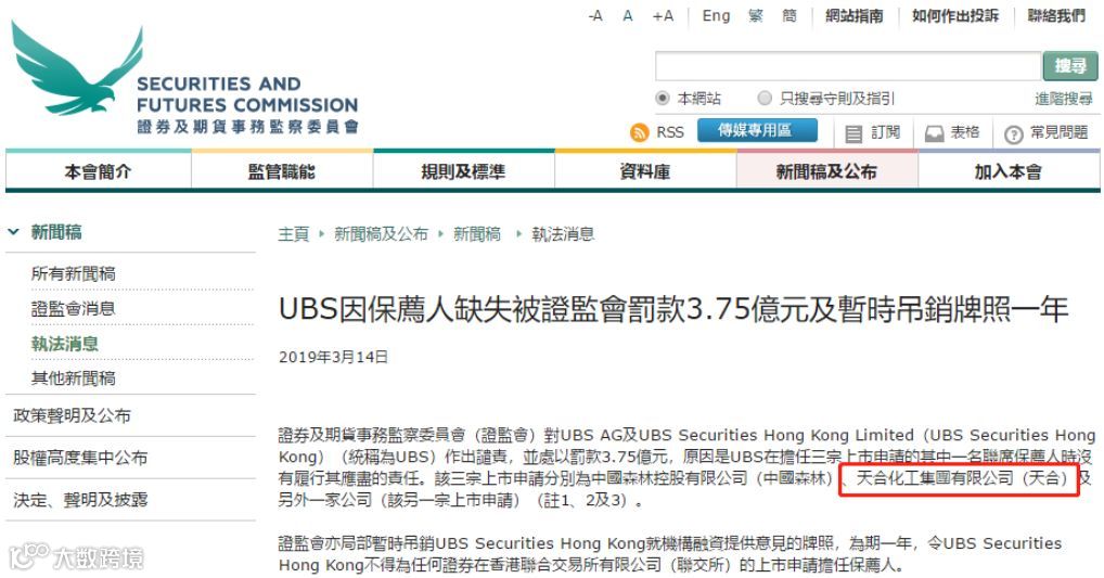 两年后,2019年3月,香港证监会对天合化工IPO时的三家联席保荐人作出巨额罚款。其中,由于涉及三家公司存在问题,瑞银(UBS)罚款高达3.75亿港元,同时UBS Securities Hong Kong就机构融资提供意见的牌照被暂时吊销一年。美林美银(Merrill Lynch)被罚款1.28亿港元、摩根士丹利被罚款2.24亿港元。