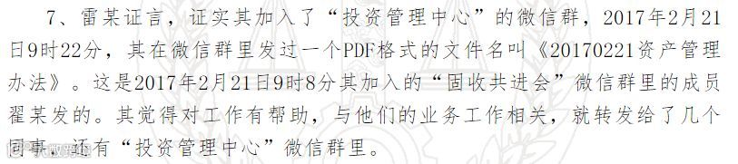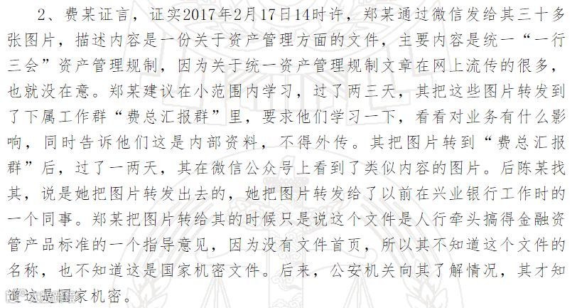 郑某看过之后将文件照片转发给了廊坊银行主管同业业务的总监费某,费某将文件照片发布到了名为“费总工作汇报群”的下属工作微信群,该群成员廊坊银行金融同业管理部总经理陈某将文件照片发给了研究机构员工翟某。