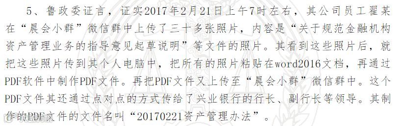 2017年2月21日7时03分许,翟某将文件照片发到了“晨会小群”和“固收共进会”两个微信群。2017年2月21日8时41分许,“晨会小群”微信群成员兴业经济研究咨询股份有限公司员工鲁政委,将上述36张图片转换成为PDF格式文档,文件名为《20170221资产管理办法》并发回“晨会小群”。2017年2月21日9时08分许,翟某将该文件回发到“固收共进会”微信群。