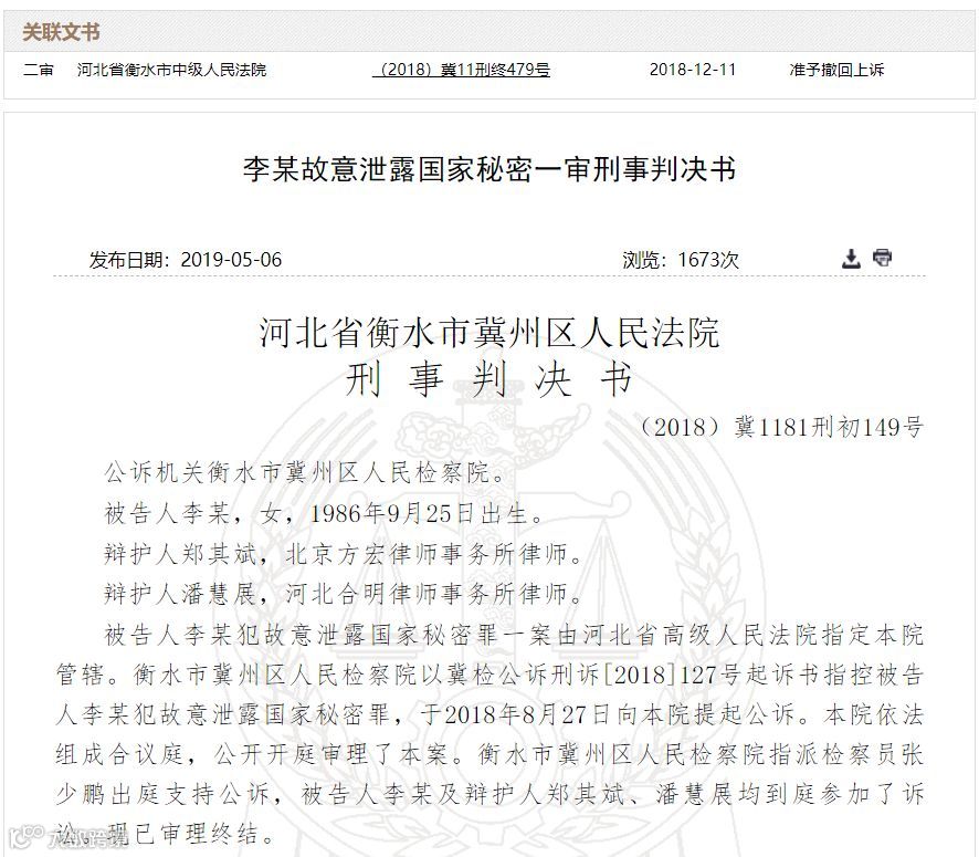 5月6日,中国裁判文书网公布了《李某故意泄露国家秘密一审刑事判决书》。2017年2月,在银监会借调工作期间,原廊坊银行员工李某通过微信将当时央行制定的、尚处于内部征求意见阶段的《关于规范金融机构资产管理业务的指导意见》及起草说明拍照并发给原单位同事。最终被判故意泄露国家秘密罪,并获一年有期徒刑。