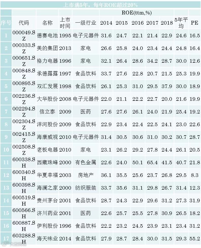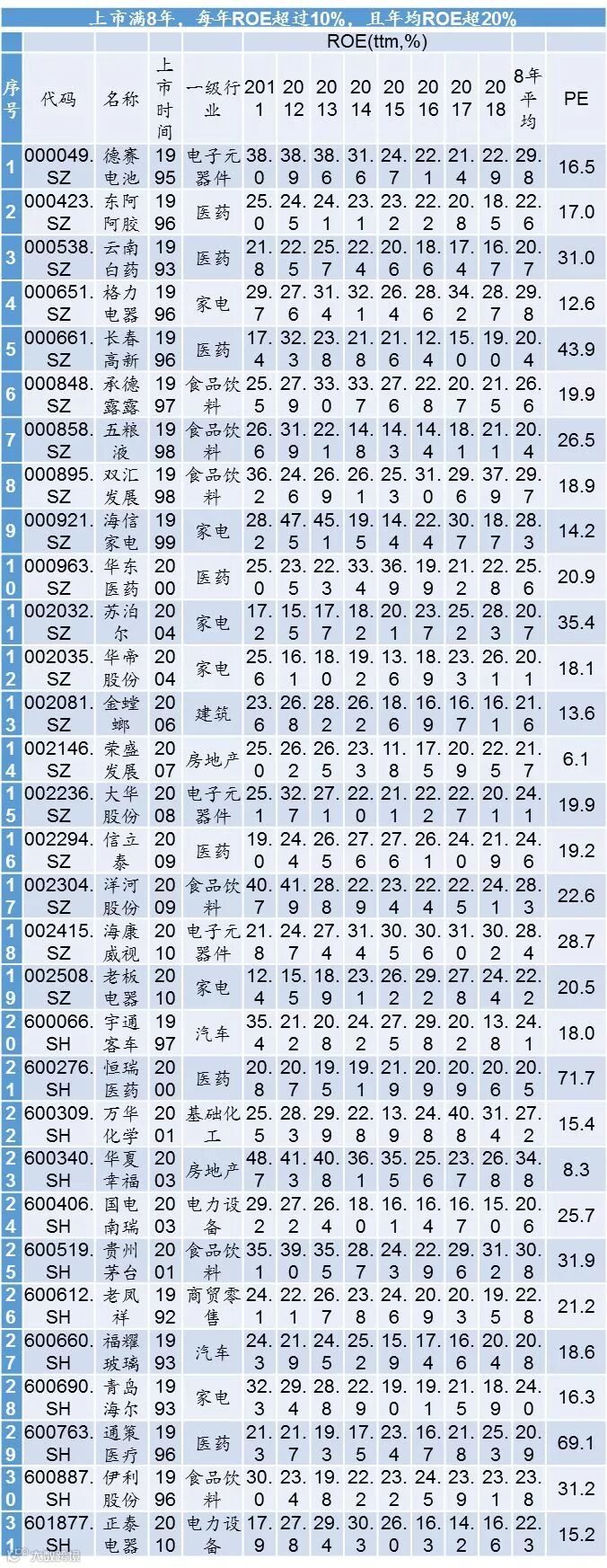 第一类:上市满8年,且每年ROE超过20%的公司。