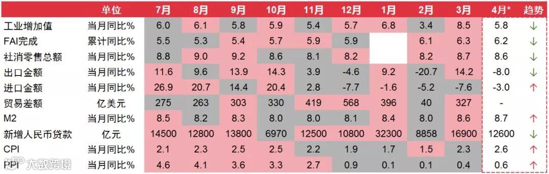 资料来源:Wind,中信证券研究部。注:统计了2018年7月至2019年4月的国内主要宏观数据公布情况,红色底色表示数据公布的时候高于市场一致预期,黑色底色表示低于一致预期,4月数据为中信证券研究部宏观组预测