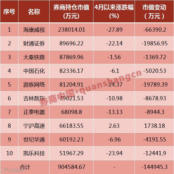 事实上,在券商前十重仓股中,共有6只跑输大盘,其中4只个股4月以来的跌幅超过-20%,明显拖累了券商自营业绩。尤其值得注意的是海康威视,截至一季度末,券商共持有海康威视6787万股,价值约23.8亿元,是券商第一大重仓股,但4月以来其跌幅高达-27.89%,同样位于前十重仓股之首。