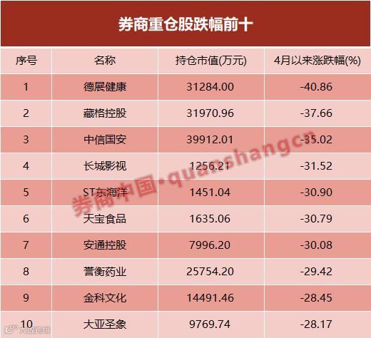 整体而言,4月以来,在有数据统计的211只券商重仓股中,仅有32只实现上涨,占比仅为15.16%,其余179只均呈现下跌趋势,占比高达84.83%,其中最大跌幅高达40%。