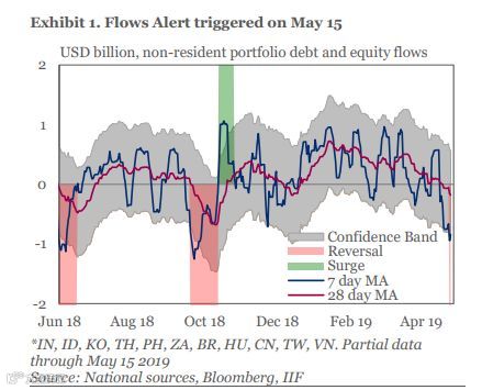 根据国际金融协会(IIF)的估算,从全球短期资金流动来看,4月份以来,全球资金流出新兴市场的幅度明显增加。从资本和金融账户的跨境资本流动来看,5月14日当天,出现较大的资本流出高峰。