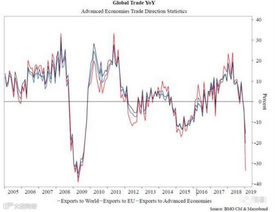 显然,全球贸易正在失速,已经像2008年次贷危机之后一样呈现瀑布式下跌,已跌至金融危机大衰退时期的水平。BMO分析师Ian Lyngern在对上述图表的评论中写道,“当各种市场在为新一轮贸易摩擦的预估影响感到担忧时,我们对出口已经下降的程度感到震惊。”