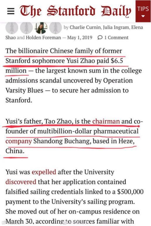 据《洛杉矶时报》和《每日邮报》报道,有一个来自中国的家庭,向中介支付了650万美元(约合4300万元人民币)用以行贿,将其女儿送入美国斯坦福大学,这一金额在所有贿赂案例中位列最高。涉事学生名叫Yusi“Molly”Zhao(赵雨思),其父亲是A股上市公司步长制药董事长赵涛。赵雨思的简历中被指伪造了帆船运动员的身份,事发后,她在今年3月底离开斯坦福大学。