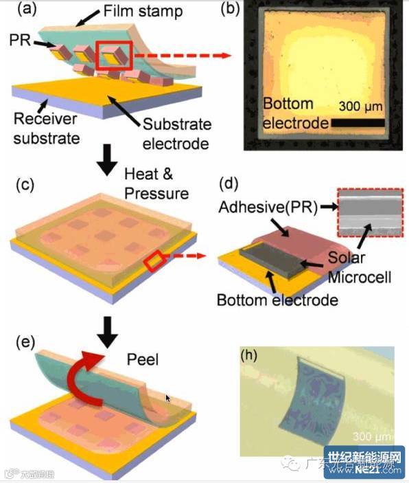 研究中制作太阳能微电池的材料是半导体砷化镓,主要利用转印transfer-printing这一技术,电池的重复使用是通过基板底部的电极反射光子回光伏电池来实现的。