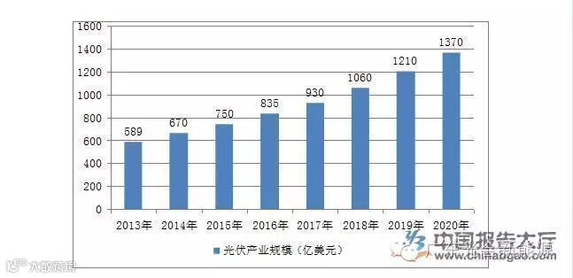 光伏产业的蓬勃发展受到温室气体减排、能源自给及能源安全的驱动。业内预计全球光伏产业规模将从2013年的598.4亿美元增长至2020年的1370.2亿美元。
