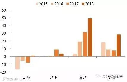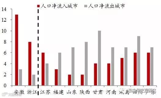 长三角城市群整体仍在大幅净流入,但内部格局也在分化。浙江人口流入继续领跑,安徽成最大“黑马”。而反观上海和江苏两地,上海由于控制人口总量,15-17年人口持续外流,尽管18年人口呈现净流入,但规模也仅有1万人;而江苏的人口净流入规模近几年一直不大,而且已经连续6年人口净流入量少于安徽。前些年安徽人口主要流向了上海、江苏和浙江,而现在安徽人口出现回流迹象,这三大流入地可能会受到一定影响。