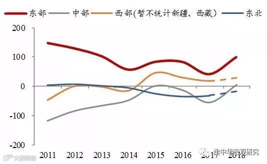 从全国层面来看,我国人口流动最明显的一大特征是“东迁”。根据我们的测算,我国东部地区持续呈现人口净流入,2011年以来人口流入总规模已经达到742万人。2018年东部地区依然延续了这一趋势,人口净流入99.3万,10个东部省市中有7个为人口净流入地区,与中西部省份相比,优势非常明显。