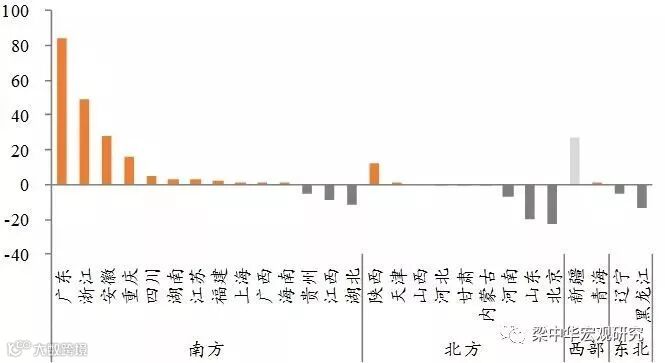 人口流动的另一大特点是“南下”。若以秦岭—淮河为线大致划分中国南北方省份,人口净流入地区基本都分布在南方,2018年南方省份(除云南暂未公布数据外)净流入人口高达168.5万人。
