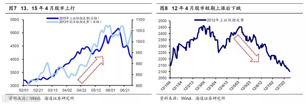 12年4月上市公司公布业绩,全部A股12Q1归母净利润同比增速由上季度的13.4%大幅下滑至0.5%,虽然当月因为金融改革上证综指有所上涨,但5月后指数依旧大幅下跌。16年4月国内超日债、华鑫钢铁等信用债风险不断暴露,人民日报刊登专访权威人士《开局首季问大势》文章,市场担心中国出现大面积债务违约,股市下跌。