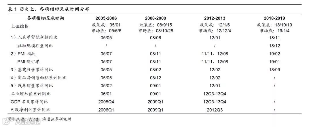 2005年领先指标:贷款余额、基建投资、商品房销售面积增速在05年5月见底,汽车销量增速在05年2月见底,同步指标:工业增加值累计同比06年1月见底,GDP名义累计同比、A股净利润累计同比分别在05Q3、06Q1见底,两类指标见底相差6个月左右,牛市第二阶段06年1月开始启动。2008年领先指标:贷款余额增速在08年6月见底,基建投资增速在08年2月见底,PMI、PMI新订单在08年11月见底,房地产销售面积增速在08年12月见底,同步指标:工业增加值累计同比09年1月见底,GDP名义累计同比、A股净利润累计同比在09Q1见底,两类指标见底相差7个月左右,牛市第二阶段09年1月启动。