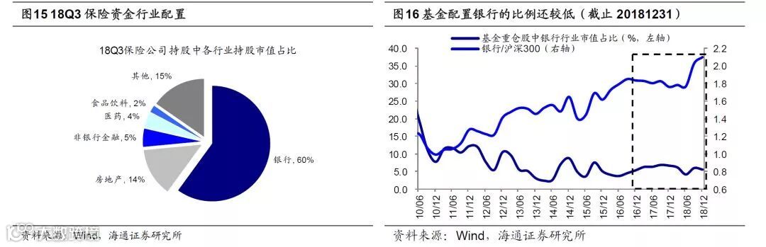 第二种情景是波幅区间上轨更高,即牛市第一阶段的上涨还没结束,市场再涨一段后才会有回撤。这种情景下,银行也有优势。市场如果上涨,未来加仓潜力最大的机构投资者是保险,保险重仓股中银行占比60%。