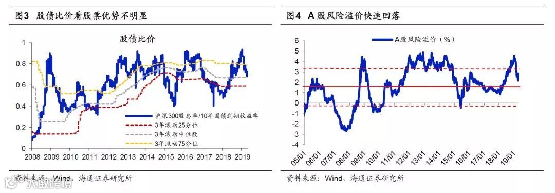 从股债资产比价角度看,沪深300最近12个月股息率/10年期国债收益率作为股债比价指标,用该指标3年滚动中位数作为参考标准,当比值明显超过中位数,比如超过3年75%分位时往往预示着股市相比债市有明显的吸引力,当比值低于3年25%分位时往往预示着债市相比股市有明显的吸引力。这指标已从1月3日0.93(超过近3年75%分位)回落至4月4日0.68(接近近3年中位数),说明股债比价角度看股票已无明显吸引力。