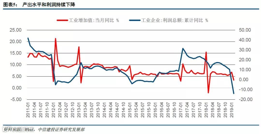2019年1-2月份,全国规模以上工业增加值同比实际增长5.3%,增速较12月下降0.4个百分点;规模以上工业企业实现利润总额7080.1亿元,同比下降14.0%,其中制造业下降幅度达到15.7%。但据统计局的测算,剔除春节因素,1-2月的工业增加值同比达到6.1%。根据我们此前关于经济企稳的判断,随着银行资本金逐步补齐,企业的信用环境改善,中国经济有望在三到四季度企稳。从目前工业企业数据来看,经济底部左侧见底的速度加快,产出水平和利润水平处于底部的左侧。