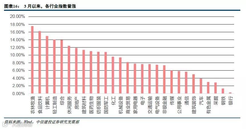 从3月21日开始,信用利率的逐步下降积累了市场估值提升的动力。3月25日,我们在充分的分析中美投资者差异之后,坚定的提出外资撤退就是回调加仓的良机。3月28日,我们展开了行业比较,率先提出地产和券商加仓的观点。3月29日,以券商和地产大幅度上涨印证了我们的判断,这实际上也是2019年A股第二波上涨的标志。