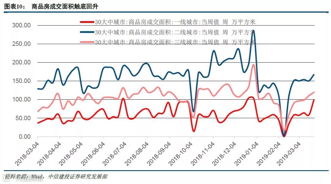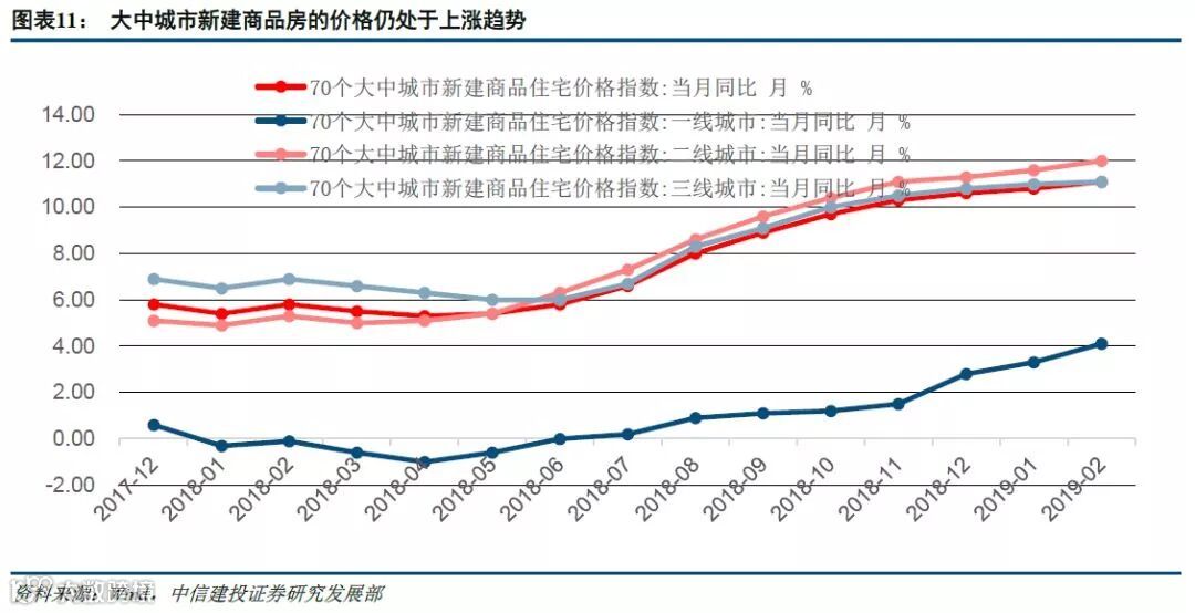 本文从底层成交面积来观察房地产行业的情况,我们可以从具体的数据来验证以上的预测。尽管总的商品房销售面积增长仍然为负。但30大中城市的商品房成交面积都在2月份触底回升;从价上面来看,70个大中城市中二、三线城市的房价仍然处于较高增长过程,一线城市房价增速较慢,但增速也有提升。考虑到信用扩张,利率下降,房地产企业融资成本也在下降,房地产行业迎来利润增速拐点可期。