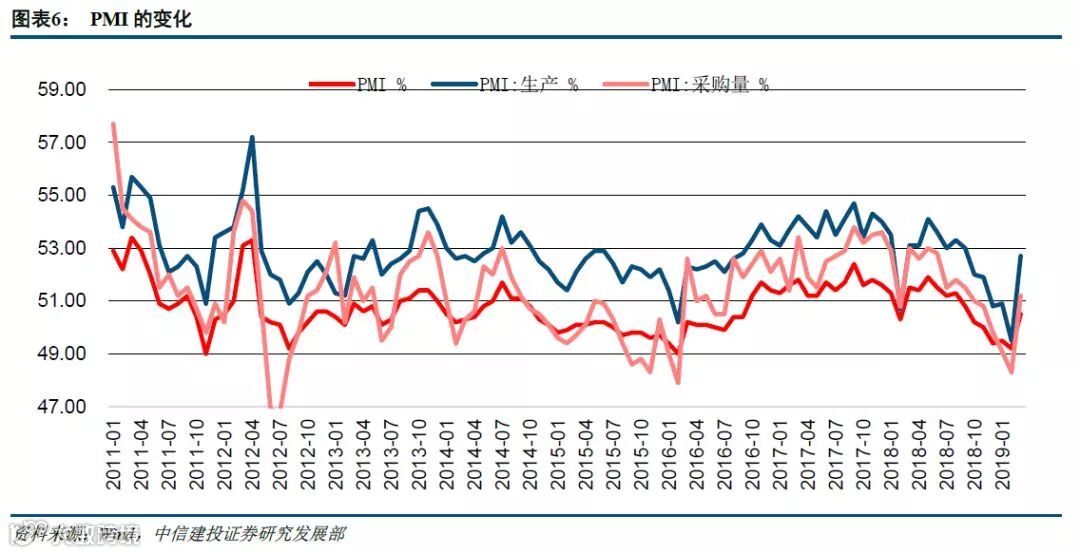 2019年3月31日PMI数据大幅度超预期:中国3月官方制造业PMI为50.5,重回临界点以上并创2018年9月以来新高,预期49.6,前值49.2。从企业规模看,大型企业PMI为51.1%,低于上月0.4个百分点,高于临界点;中、小型企业PMI为49.9%和49.3%,分别比上月上升3.0和4.0个百分点。从分类指数看,在构成制造业PMI的5个分类指数中,生产指数、新订单指数和供应商配送时间指数高于临界点,原材料库存指数和从业人员指数低于临界点。2019年3月PMI数据反映出我们在《信用宽松与牛市全景》报告的推断:信用宽松的过程逐步解除了经济周期上行的约束,经济触底企稳已经初见端倪。