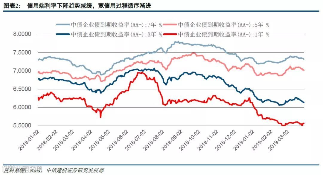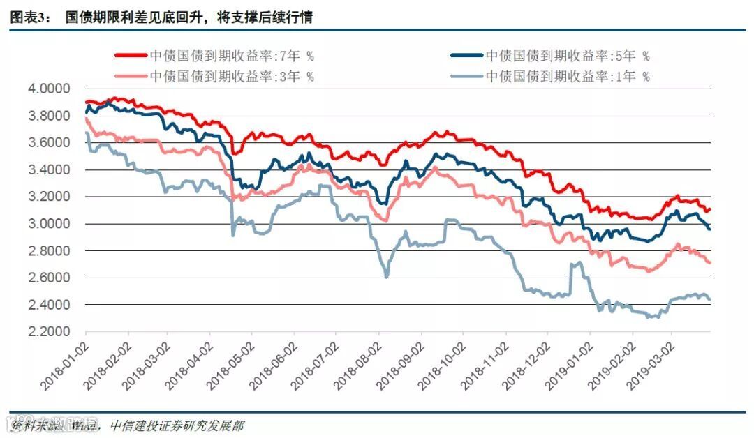 从国债利率期限结构来看,国债利率在2019年3月下旬与信用债保持类似的下行过程,这意味着货币政策还是处于宽松的状态。准备金在当前条件下是不构成信用扩张的约束。综合图表2和图表3的利率变化可知,信用总量宽松过程仍然在持续,结构优化初见端倪。