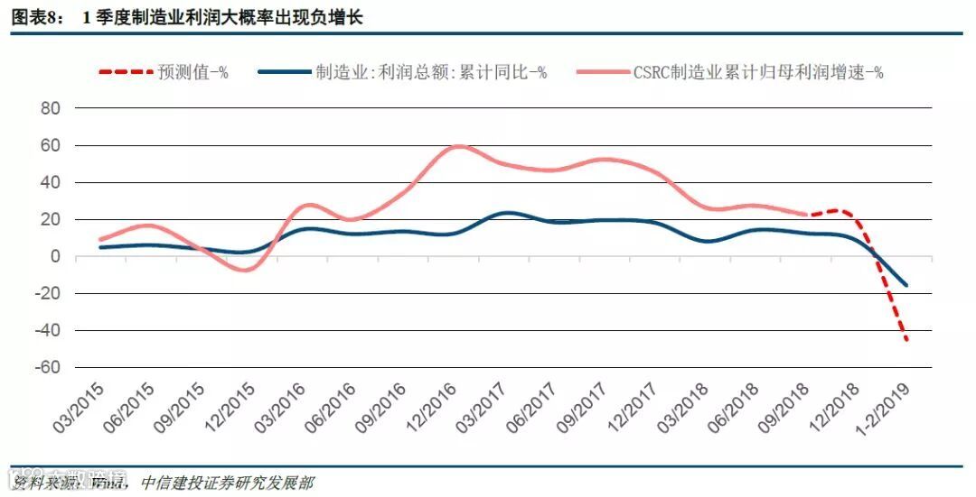 对于制造业,工业企业中的制造业利润增速与全A制造业的利润增速变化趋势一致。根据统计局公布的数据,2018年12月和2019年1-2月的制造业利润增速分别为8.7%和-15.7%,因此我们可以得到全A制造行业的利润增速在一季度仍然下行寻底的过程中。