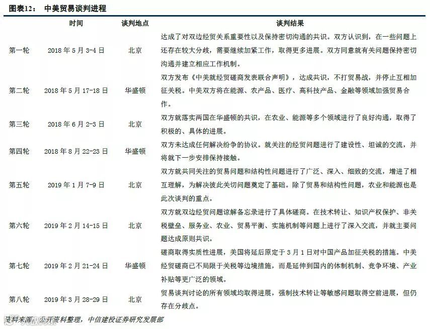 3月28日,商务部发言人高峰在例行新闻发布会上针对中美是否正在接近着达成协议的提问表示,中美虽取得一些进展,但是仍有大量工作有待完成。下周,刘鹤副总理将前往美国华盛顿,与美方进行第九轮中美经贸高级别磋商。中美之间的贸易谈判已经进行了八轮。前四轮在中美贸易战争端时期,伴随美方的态度的强硬、贸易战的深化而紧张。后四轮开启于G20中美阿根廷会晤以后,谈判总体风格明显转向,谈判朝着双方缓和的势态发展。我们预期中美贸易谈判达成协议符合双方的利益,达成协议的概率较高。
