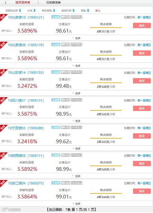从工商银行网银显示,7只地方债军均已跌破面值,目前价格最高的地方债是浙江债报价99.01元,而价格最低的北京债,两期债券的价格均为98.58元,跌破发行价100元。