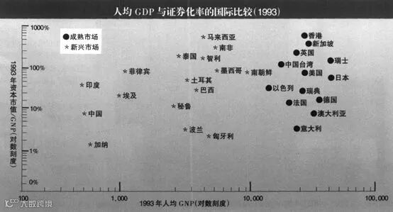 纵观90年代世界一流股市所在国的经济实力,其人均GNP水平无一不在10000美元之上,而人均GNP水平是 较能客观反映一国综合国力的代表性指标,我国人均GNP仅为450美元左右,不足发达国家的5%,很难想象在一个经济实力不很弱的国家中会出现一个世界一流的股市。