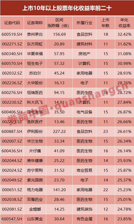 如果以年化收益来看,上市超过十年的股票中,贵州茅台的年化收益最高,达到32.42%,这也是为什么茅台一直是A股投资者最为喜爱的股票,成长足够快;东方雨虹、华夏幸福、恒生电子的年化收益率也均超过30%,排在二至四位。