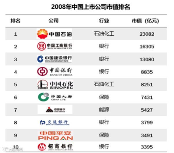 2008年,中国上市公司的市值排名前十位,几乎全是能源和银行保险,第一是中国石油,第二是中国工商银行,第三是建行。