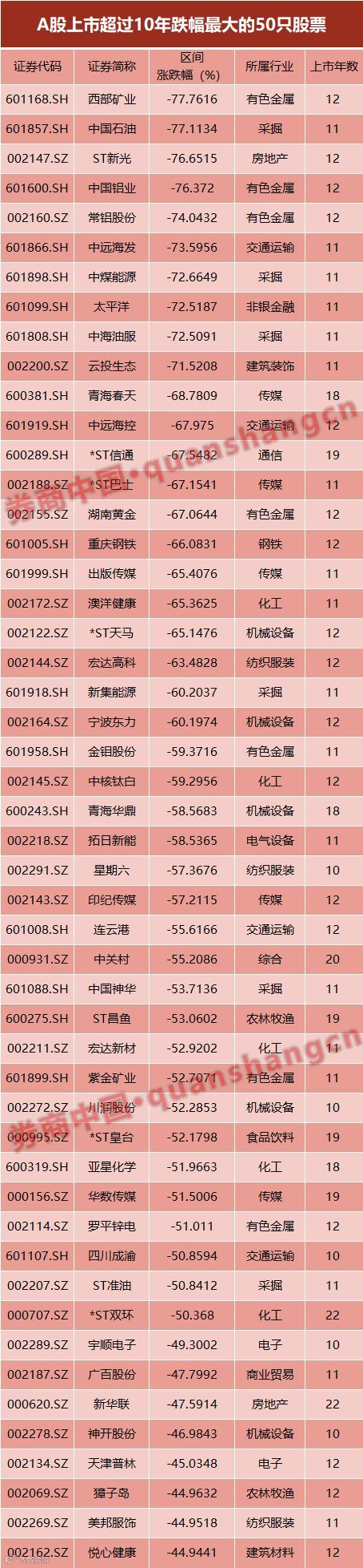 数据显示,西部矿业是两市表现最差的股票,上市至今跌幅高达77.76%,成为上市超过十年的股票中的第一熊股;排名第二的则是鼎鼎大名的中石油,上市至今跌幅高达77.11%;ST新光跌幅达76.65%,位居第三。