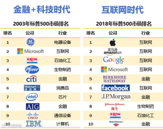 再来看美国,1980年为能源时代,市值前十里几乎全是石油化工;1990年,则是消费+制药时代;到了2003年,则演变成金融+科技;而到了2018年,则市值前十里几乎全是互联网公司,苹果、亚马逊、谷歌和微软等排在全球前四位。