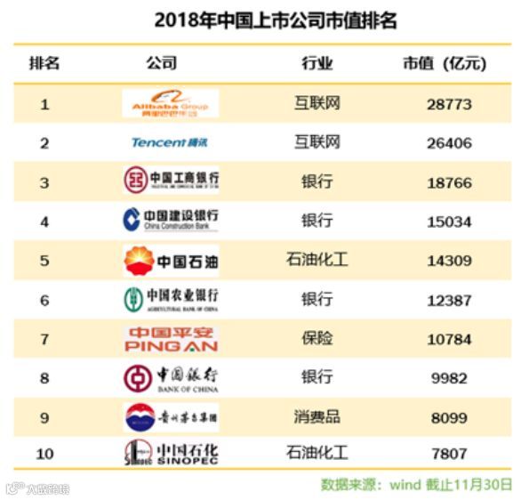 2018年,即十年后,中国上市公司的市值排名已然发生不小的变化,阿里巴巴和腾讯两家互联网公司成为中国市值老大和老二。不过,银行保险和能源股依旧榜上有名。