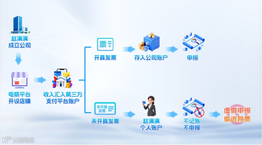 原来,该公司的偷税操作并不复杂:根据电商平台规则,交易完成、买方确认收货后,款项会先汇入与店铺绑定的第三方支付账户,卖家可自行提现。为了少缴税款,赵满满将公司部分未开票收入,通过第三方支付平台直接转入自己的个人银行账户——这些收入既未记入公司账簿,也未进行纳税申报,完全脱离了税务监管视线。