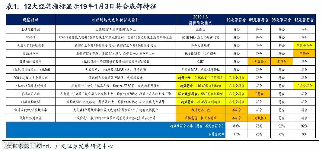 我们在3.8《否极泰来:A股历史性底部全对比》中判断上证综指19年1月4日为本轮熊市大底,2440点与05年998点、08年1664点、13年1849点三次熊市底部重要性相当,属于A股的历史性底部之一,广发策略构建的“三大维度,二十指标”经典底部指标体系验证19年1月3日已基本符合底部特征——静态的资产联动、市场技术、市场行为、估值等指标均已符合熊市底部特征,而动态的历史底部对比也显示估值底/股价底于19年1月初同步出现。