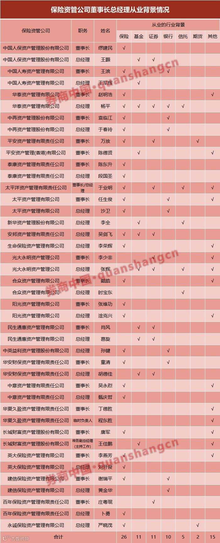 国寿资产董事长王滨、中再资产董事长袁林江、中再资产总经理于春玲、太平资产总经理沙卫、中英益利资产总经理孙键、华安财保资产董事长童清、建信保险资管董事长谢瑞平、建信保险资管总经理黄金华均有过银行从业经历。