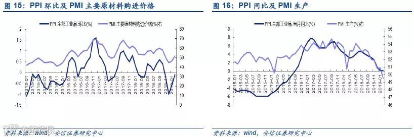 2019年以来PPI走势好于预期。2月PPI持续回升,环比-0.1%,较上月上行0.5个百分点;同比则为0.1%,与上月持平。PPI环比1、2月份持续改善,分别提升0.4 pct、0.3 pct。同时,PMI主要原材料购进价格1、2月份数值分别为46.3%、51.9%,上涨超过荣枯分水线。